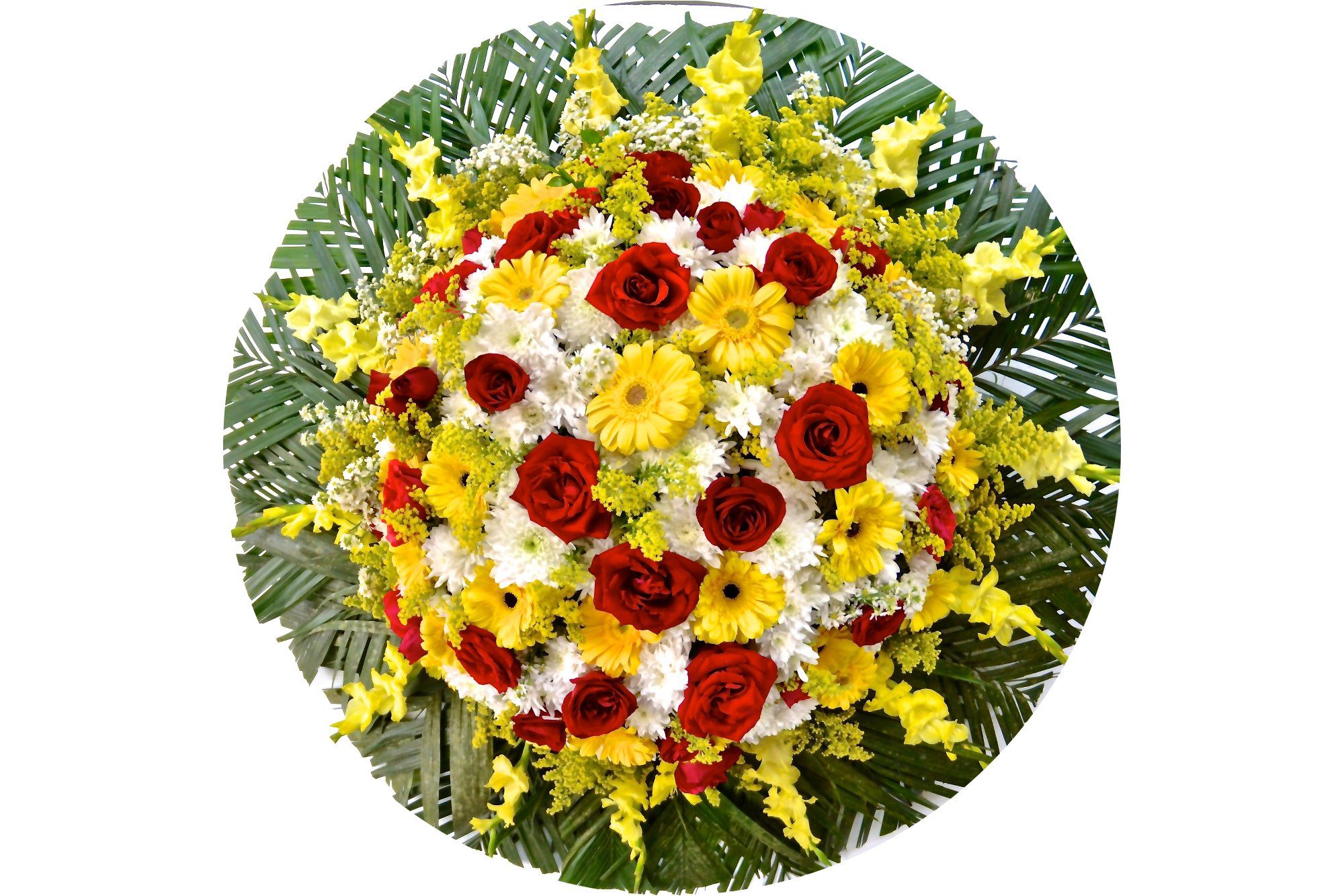Coroa de Flores feita com rosas vermelhas, gerberas, tango, flores brancas e palmas.
