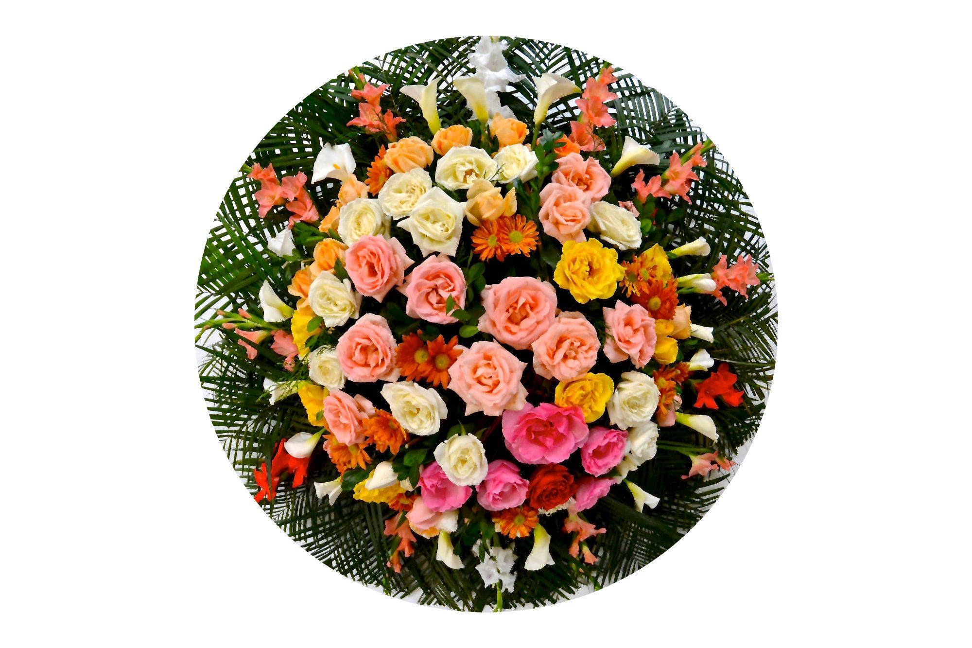 Coroa de Flores Luxuosa feita TODA de rosas coloridas e palmas.
