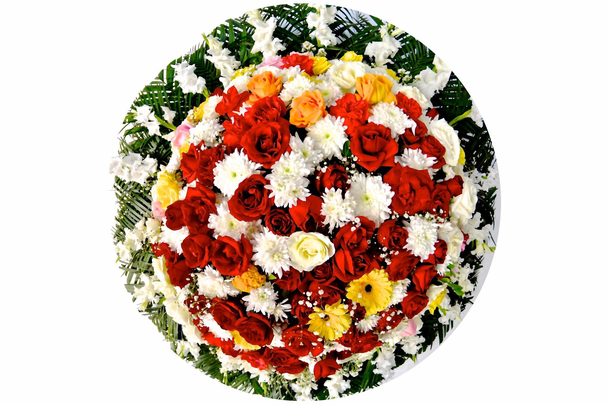 Coroa de Flores feita com rosas brancas, vermelhas, amarelas, gerbera, flores do campo e palmas.